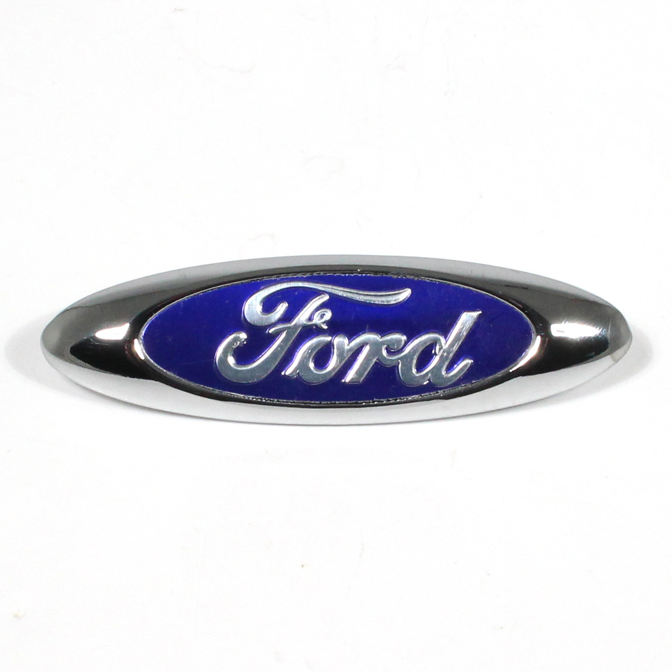 Blue Ford oval emblem on silver back. Dimensions 88mm long x 25mm tall, held with two 3mm pins with 50mm centres. Used approx 1966 onward and mounted to lower near side wing.
