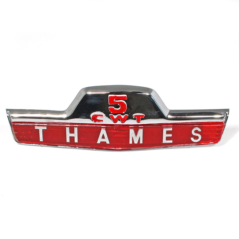 re-manufactured 5CWT chrome plate name plate for radiator grill panel (under bonnet panel) with Thames word plastic insert fitted. we offer the this with a moulded plastic rear engraved red background with three fixing pins on the back.